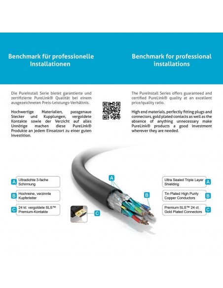 - Contatti SLS Placcati Oro: Contatti di precisione placcati oro 24 kt con PureLink SLS (Secure-Lock-System) forniscono conducibilità migliorata e stabilità meccanica. Il meccanismo SLS garantisce una connessione sicura, riducendo il rischio di scollegamenti accidentali in distribuzioni rack o fisse AV.