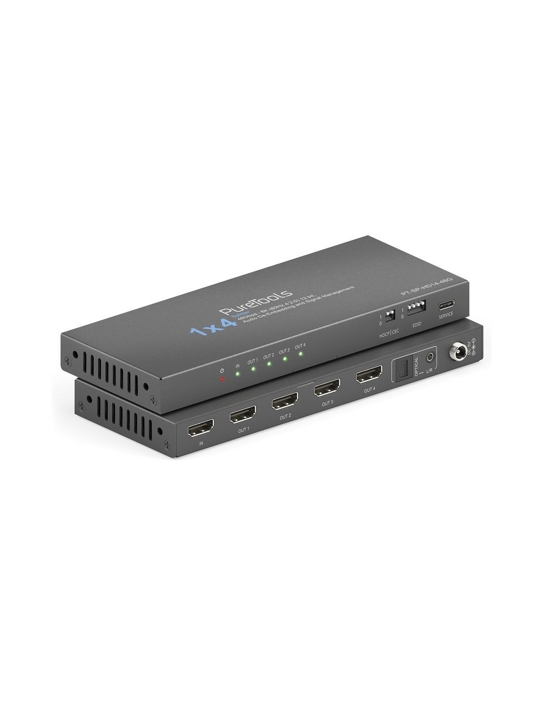 PT-SP-HD14-48G offre distribuzione del segnale HDMI 2.1 ad alta larghezza di banda, gestione avanzata EDID e HDCP e estrazione audio flessibile. Combinando downscaling completo e controllo CEC, l’unità consente l’integrazione fluida di hardware AV sia nuovo sia esistente, garantendo un funzionamento affidabile in sale riunioni, ambienti di controllo e installazioni ibride.
