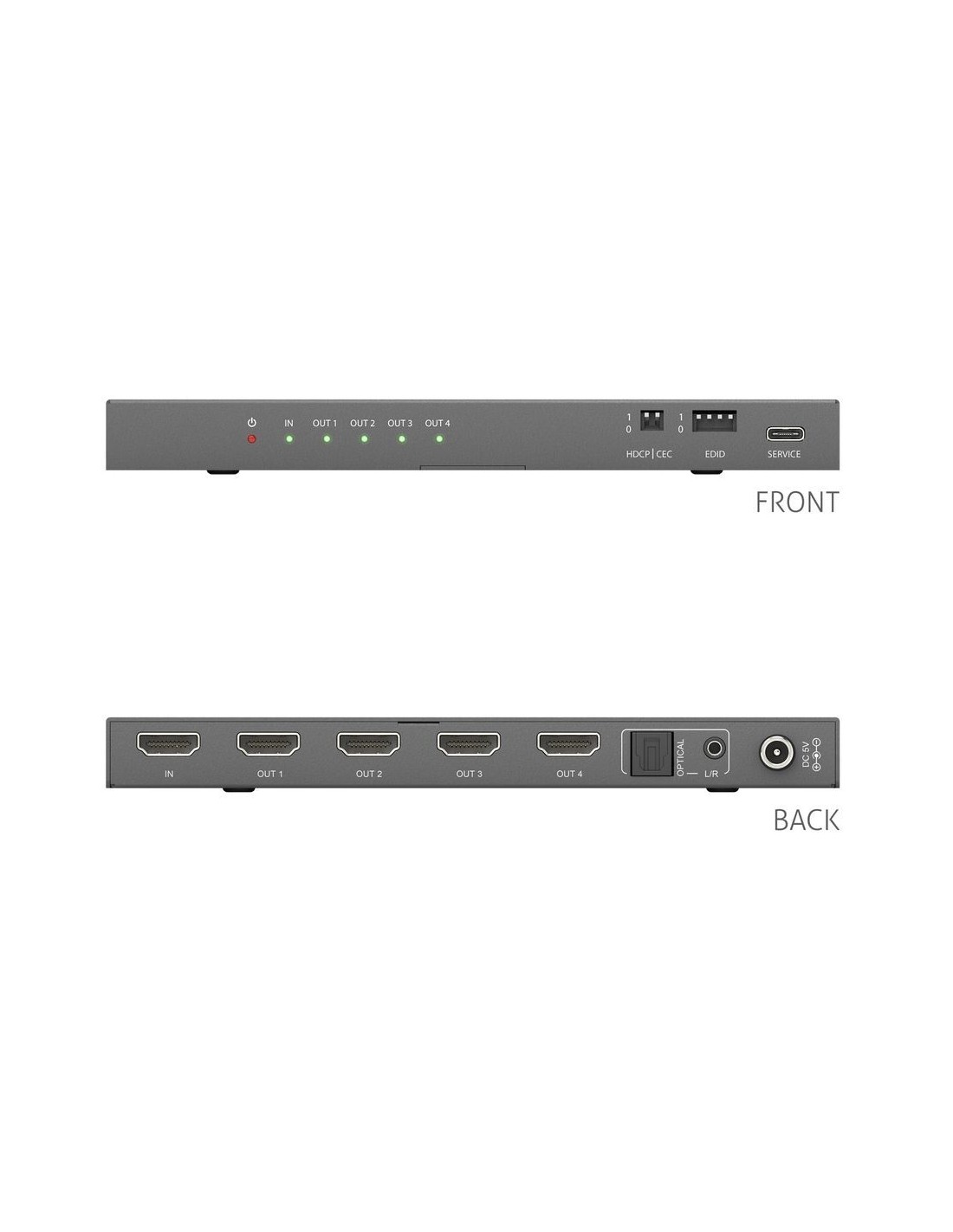 - Opzioni di de-embedding audio: Le uscite integrate digitali SPDIF e analogiche da 3,5 mm consentono l’estrazione dei segnali audio dai flussi HDMI. Questa funzione permette l’instradamento diretto verso amplificatori o processori audio esterni in sale conferenze, auditorium o sistemi di digital signage senza necessità di hardware aggiuntivo.