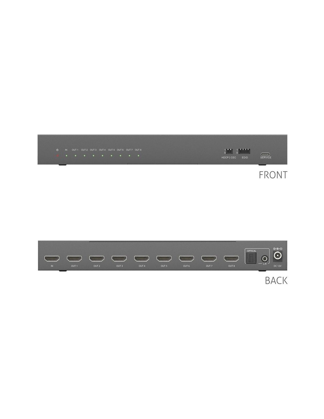 Controllo CEC e funzioni di downscaling: Un interruttore dedicato CEC On/Off consente un controllo preciso della comunicazione tra dispositivi. Il downscaling integrato supporta la conversione da 8K a 4K e da 8K/4K a 1080p, permettendo l’integrazione con display a risoluzione inferiore in ambienti tecnologici misti.