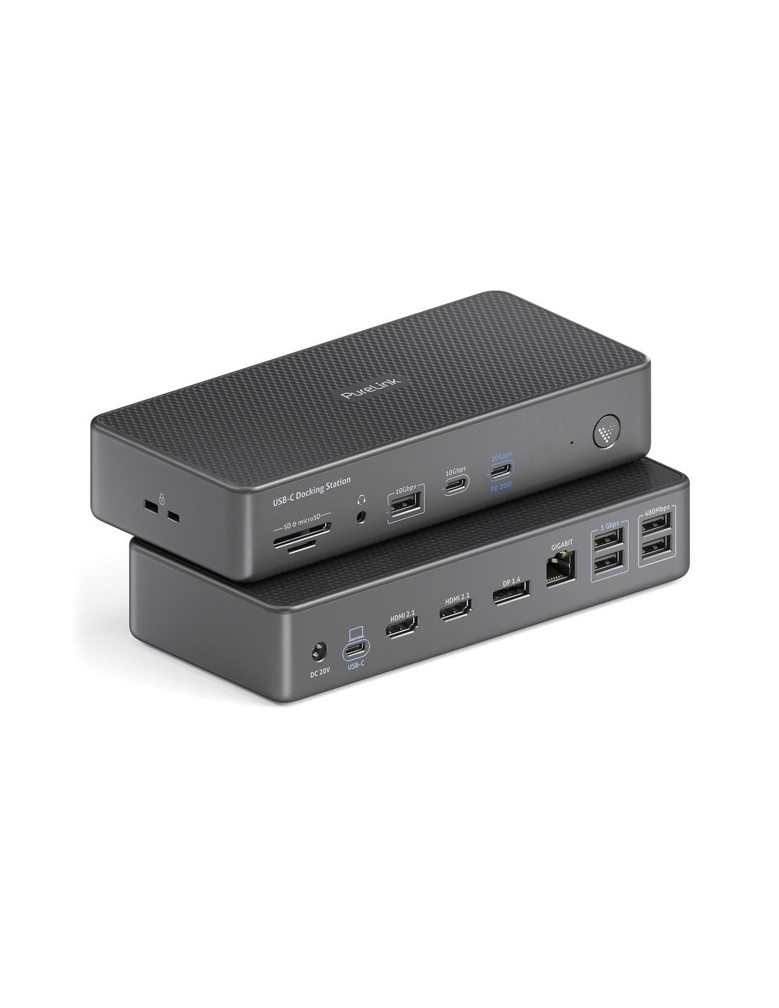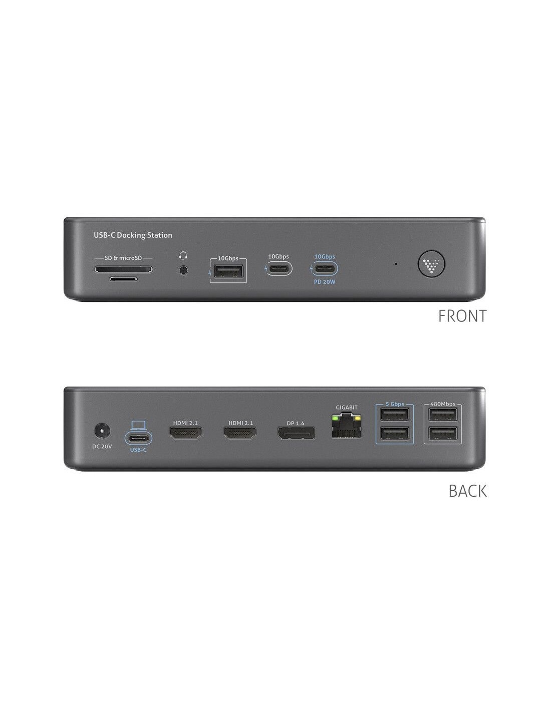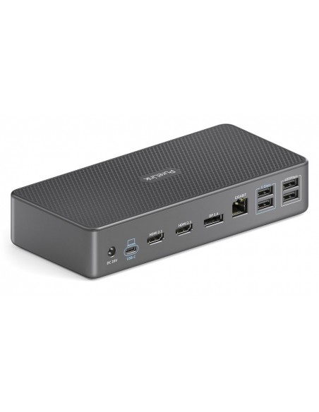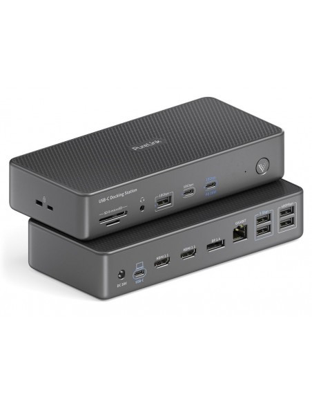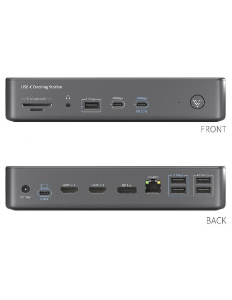 - Supporto completo per periferiche USB: Tre porte USB offrono velocità di 10 Gbps, con ulteriori porte che supportano 5 Gbps e 480 Mbps, consentendo trasferimento dati rapido e ricarica dei dispositivi. Il dock supporta fino a sette periferiche, inclusi dispositivi USB 2.0 legacy e USB 3.2 ad alta velocità, garantendo compatibilità con un’ampia gamma di accessori AV.