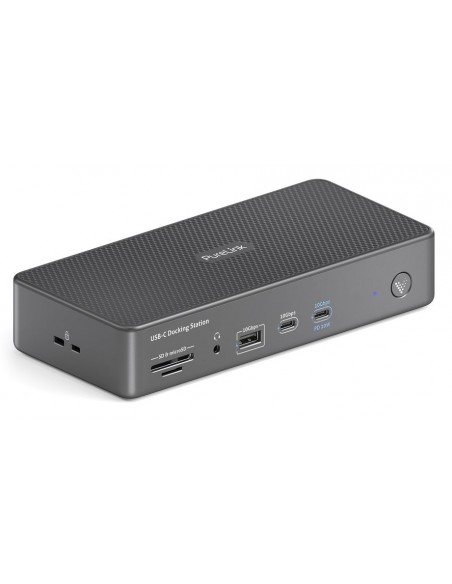 - Interfacce AV e di archiviazione integrate: Il dock include un’uscita audio da 3,5 mm per cuffie o altoparlanti, oltre a uno slot per schede SD e microSD. Queste interfacce offrono un accesso diretto alla riproduzione audio e allo storage rimovibile, supportando flussi di lavoro multimediali in ambienti di riunione e presentazione.
