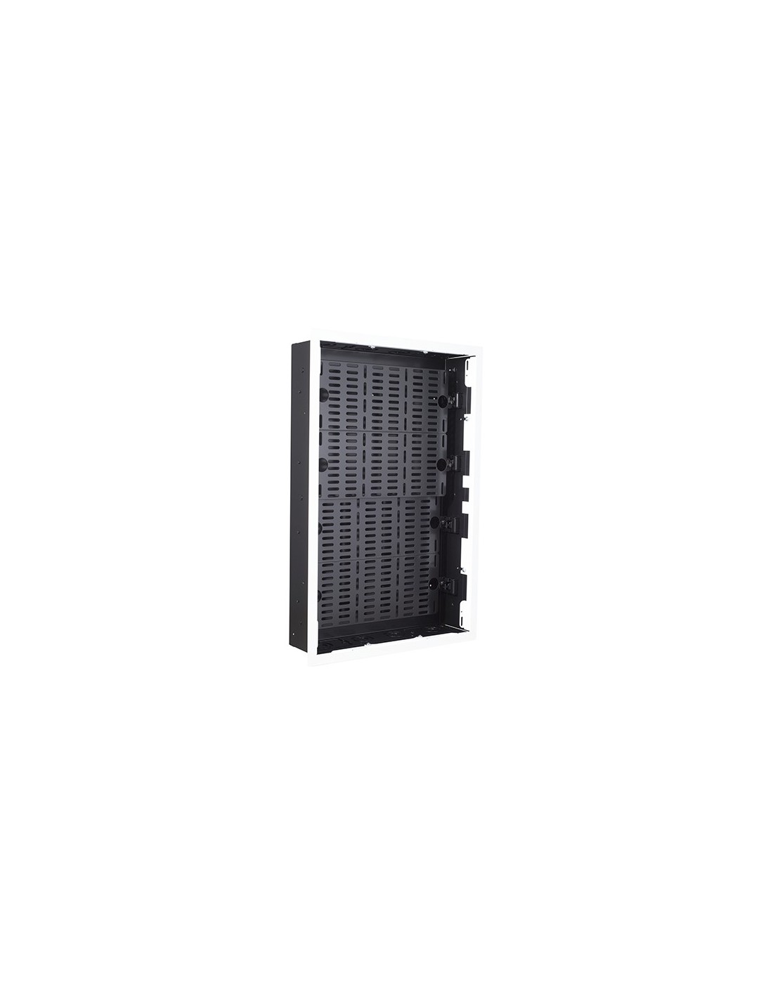 Scatola da incasso con ampio spazio per riporre e installare in modo ordinato e organizzato diversi dispositivi AV. Il pannello interno, divisibile e agganciabile a diversi livelli di profondità permette di ottimizzare al meglio il posizionamento dei componenti. Dotata di flangia verniciabile bianca.