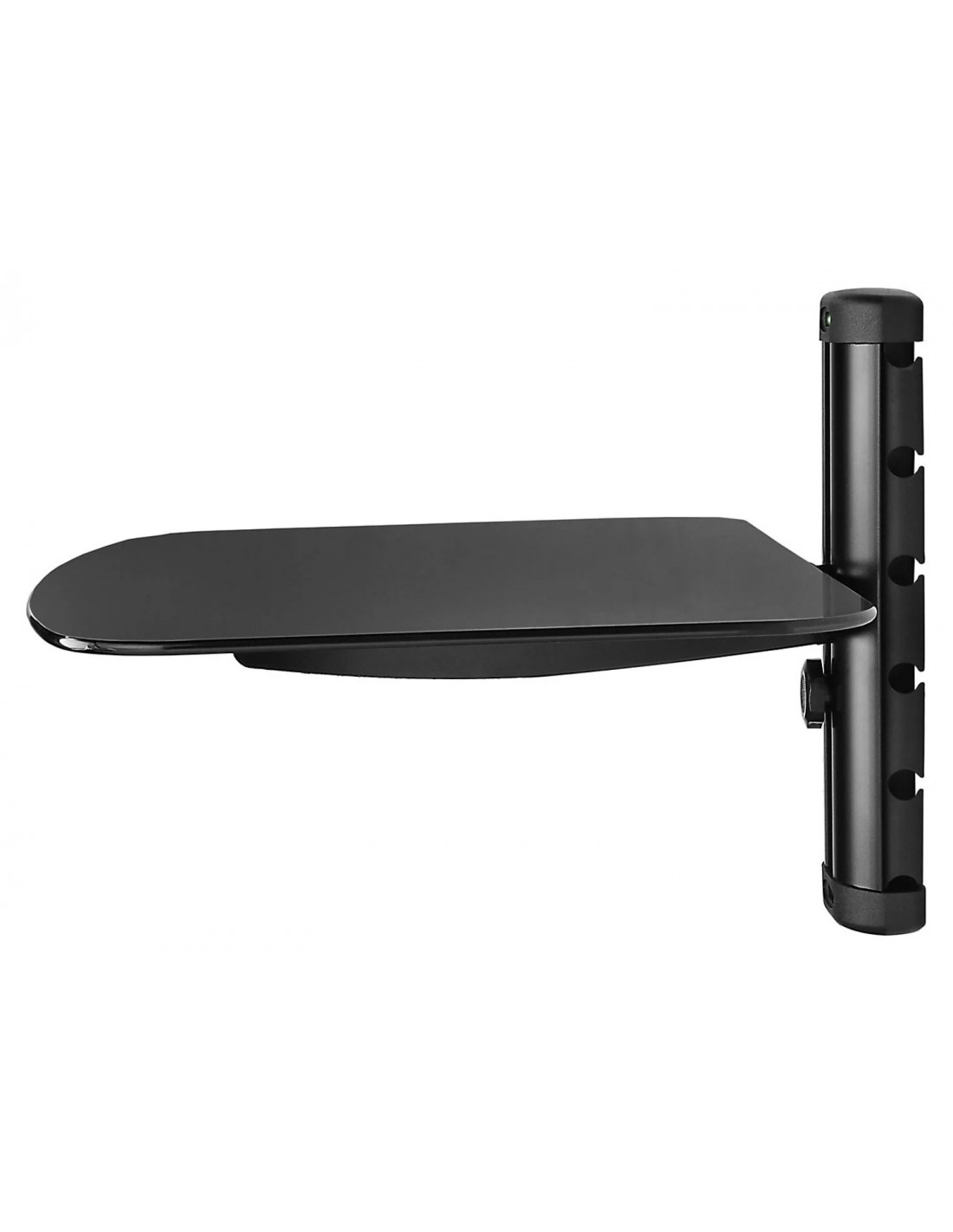 - Un resistente ripiano in alluminio può essere regolato per accogliere componenti AV di qualsiasi altezza