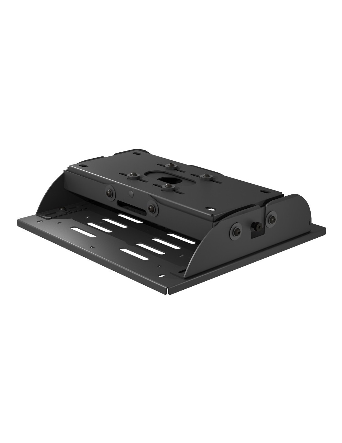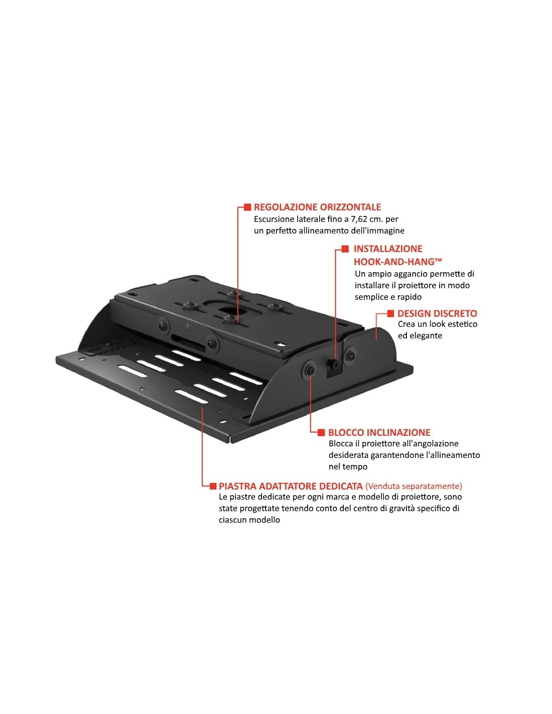 Il supporto per proiettori di grandi dimensioni di Peerless-AV è stato progettato per semplificarne l’installazione e l’allineamento. La funzione Hook-and-Hang™ offre estrema flessibilità durante la fase di fissaggio del proiettore alla montatura. Le funzioni di inclinazione e rotazione sui vari assi, sono bloccabili per impedire anche il minimo spostamento dell’immagine. Le piastre adattatore dedicate (vendute separatamente) sono realizzate specificamente per ogni modello e marca di proiettore e sono progettate per posizionare il centro di gravità al centro esatto del supporto, rendendo le regolazioni di allineamento semplici e rapide ed evitando il tipico disallineamento nel tempo dei supporti universali.