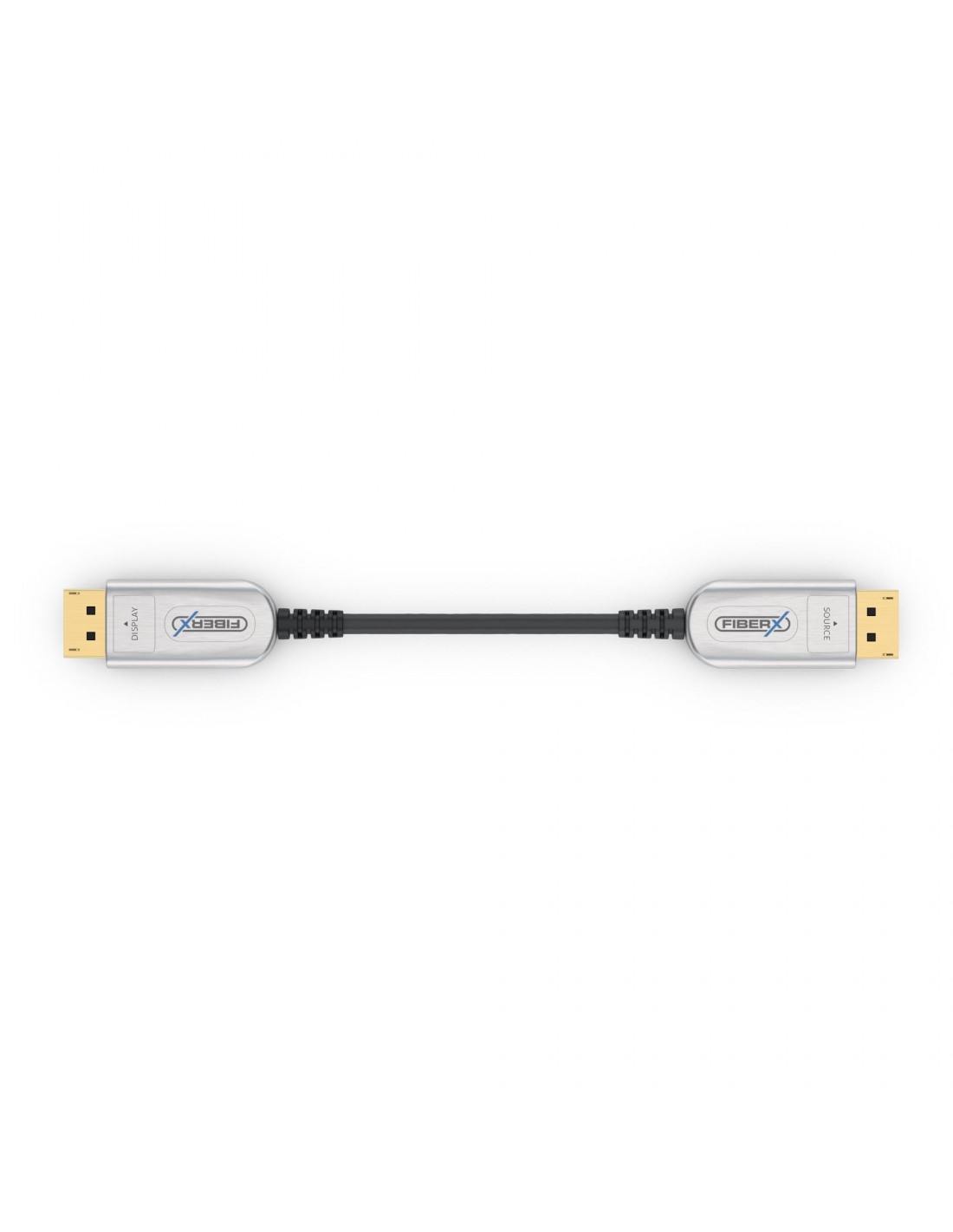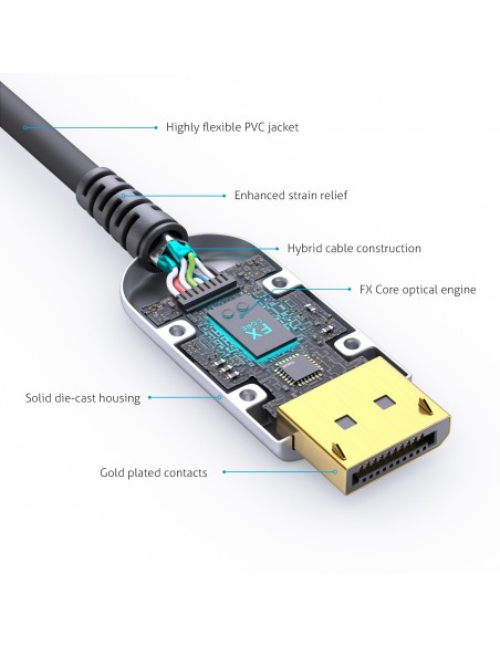 Il cavo ibrido AOC "integrato" DisplayPort via fibra ottica FX-I250 offre alcuni vantaggi rispetto alle soluzioni in pura fibra ottica ed è progettato per DisplayPort (HDMI / DVI anche disponibili). Vengono supportate risoluzioni fino a 8K / UltraHD-II / 4320p con 60Hz nonché 4K / UltraHD / 2160p con 144Hz (8bit) o 120Hz (10bit) su distanze fino a 100 metri. Il design ibrido fibra/rame supporta EDID e HDCP (fino a v2.2) e DPCP nonché segnali audio digitali.