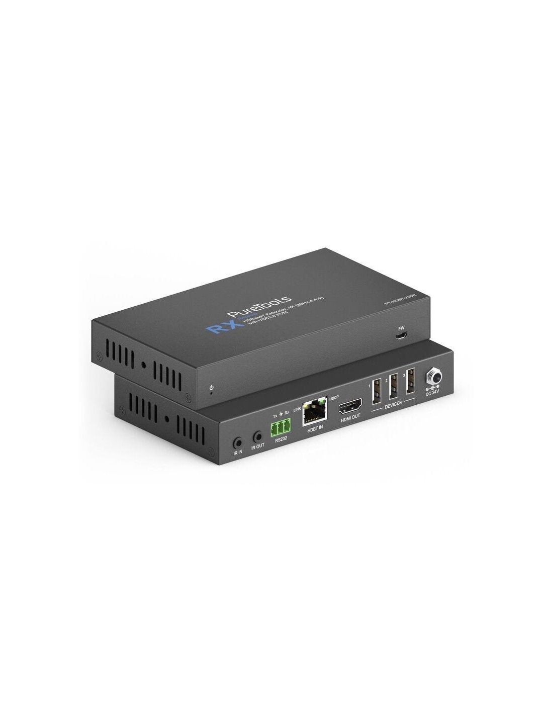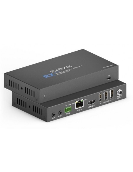 Sono fornite tre porte USB-A sul ricevitore per l'integrazione di dispositivi USB 2.0. I loro segnali vengono trasmessi via HDBaseT alla porta USB-B sul trasmettitore da parete, al quale è poi collegato il PC "host" di ricezione. Ad esempio, dispositivi di memoria USB possono essere collegati sul sito RX e facilmente accessibili dal PC host rispettivo alla postazione di lavoro o punto di presentazione. È anche possibile collegare dispositivi KVM come tastiera, mouse e webcam per uso con PC remoti. È supportato USB 2.0 Hi-Speed, che consente l'integrazione di dispositivi vecchi e nuovi. Dispositivi con USB 3.x o superiore trasmettono così con velocità dati massima USB 2.0 Hi-Speed di 480Mbps.