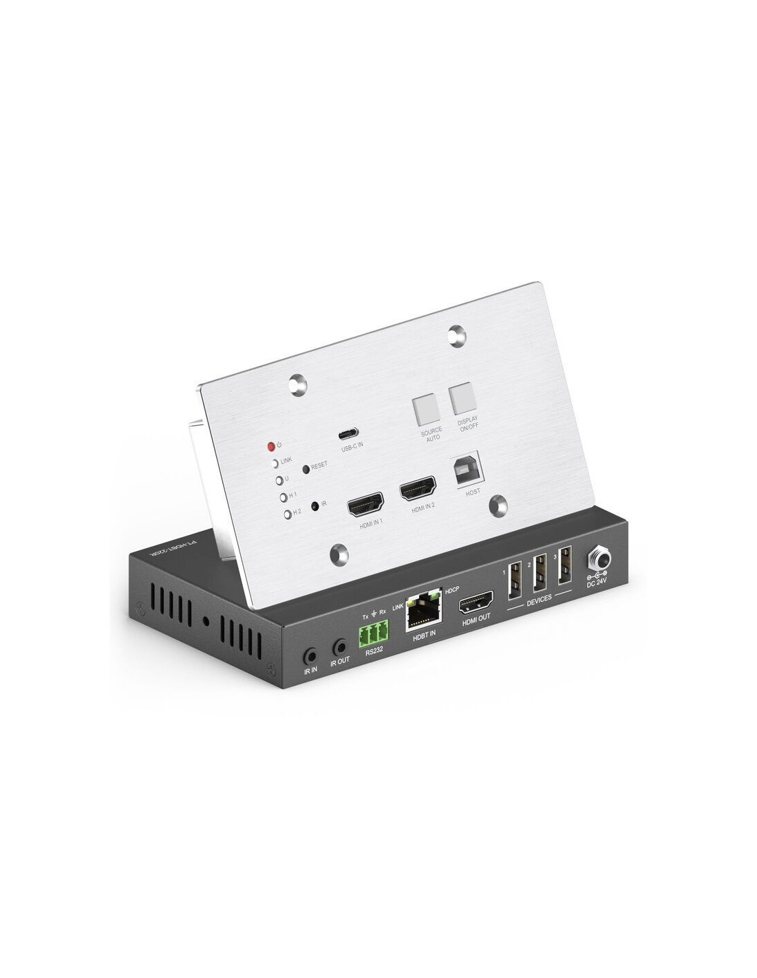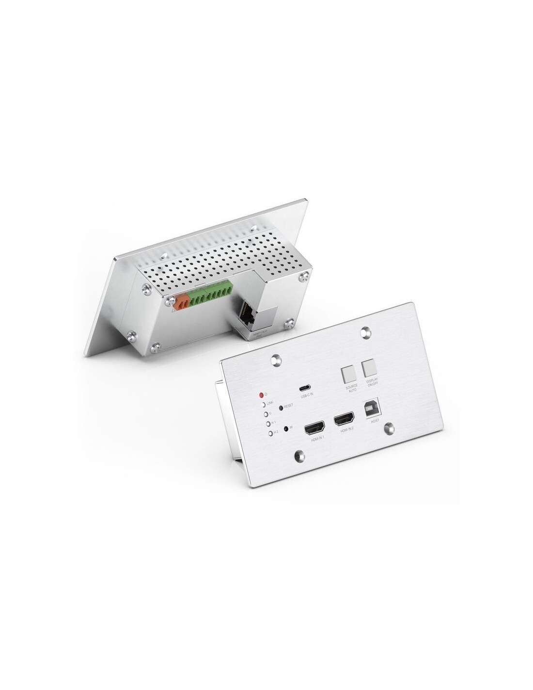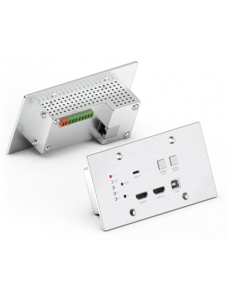 Due pulsanti sono disponibili sul trasmettitore da parete per il controllo del sistema. Il pulsante "Display ON/OFF" è usato per lo spegnimento remoto del display e può essere programmato via IR learning o RS232. I segnali di ingresso HDMI / USB-C possono essere rilevati e commutati automaticamente o commutati manualmente via pulsante "Source-Auto", incluso supporto CEC.
