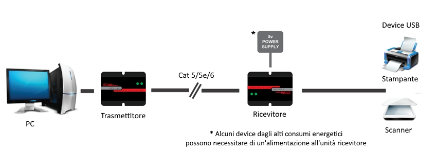 Questo prodotto può essere utilizzato con un’ampia varietà di dispositivi USB, quali webcam, stampanti, tastiere e hard-disk fino a 50 metri utilizzando cavo Cat-5e/6.
