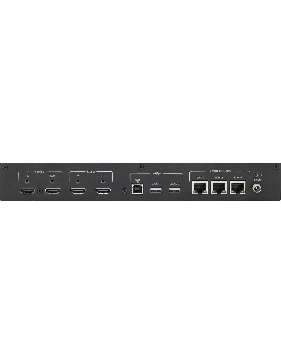 Il trasmettitore ULTRA-4K offre 2 ingressi HDMI ed una porta USB per la connessione a un PC host. Il trasmettitore fornisce anche due uscite HDMI locali e un hub USB a 2 porte. Il ricevitore remoto si collega al trasmettitore utilizzando un solo cavo Cat-6. Il trasmettitore fornisce 3 uscite RJ45 in modo da poter collegare più di un ricevitore per consentire l'accesso al PC da più postazioni remote. Quando più di un ricevitore è collegato allo stesso trasmettitore, tutti i ricevitori mostrano le stesse due uscite video e la funzione tastiera/mouse viene automaticamente instradata in base all'attività dell'utente.