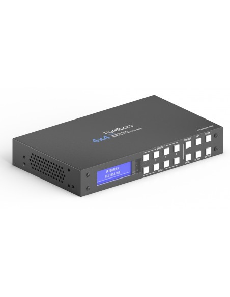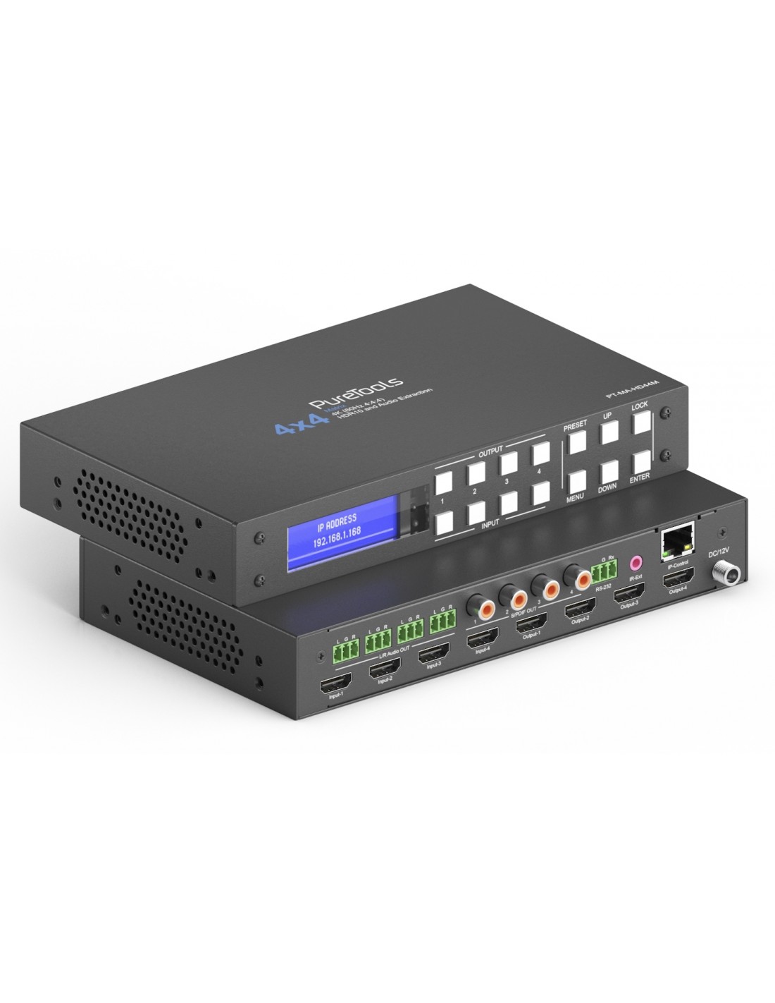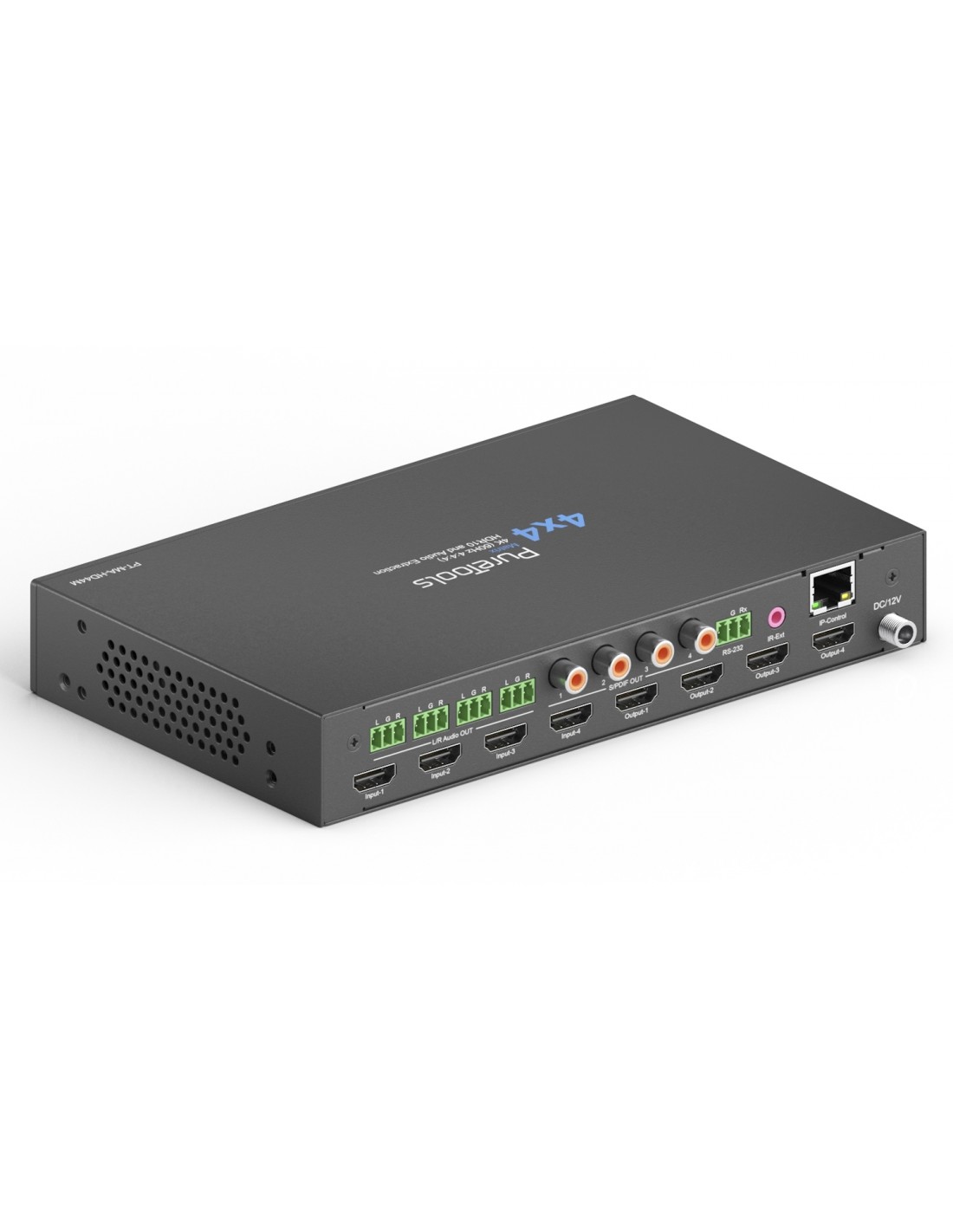 La matrice HDMI 4x4 4K PT-MA-HD44M distribuisce quattro segnali di ingresso HDMI 2.0 in modo indipendente su quattro uscite HDMI con piena larghezza di banda di 18Gbps per risoluzioni fino a 4K@60Hz (4:4:4), inclusa la compatibilità HDCP 2.2. Il segnale audio di ciascun ingresso può essere de-embedded sia come segnale analogico (stereo, Phoenix) sia come segnale digitale (S/PDIF, coassiale) per essere inoltrato a un sistema audio. La matrice dispone di diverse opzioni di controllo, tra cui pulsanti sul pannello frontale o telecomando IR (incluso) con display LCD integrato. I segnali del telecomando vengono ricevuti da un ricevitore IR integrato o remoto (3,5 mm, incluso). Inoltre, la matrice può essere controllata e configurata tramite RS232 o via IP utilizzando un’ampia interfaccia web GUI accessibile da qualsiasi browser. Il telaio molto compatto (circa metà larghezza rack) può essere installato anche in posizioni nascoste grazie alle funzionalità di controllo remoto incluse.