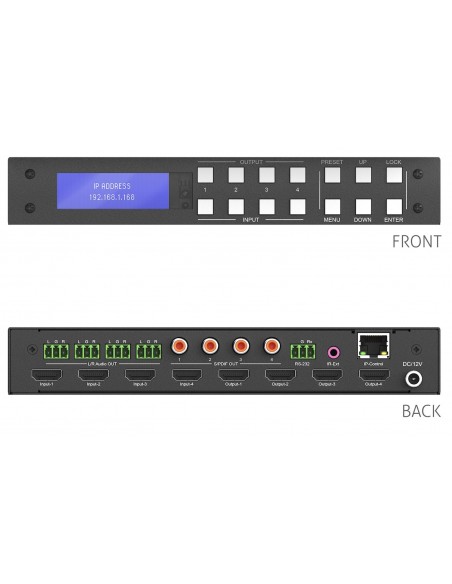 Un ampio display LCD sul pannello frontale mostra a colpo d’occhio tutte le impostazioni e configurazioni rilevanti. Le estese impostazioni di menu sono accessibili tramite telecomando o pulsanti sul pannello frontale. Qui è possibile regolare, tra le altre cose, le impostazioni audio e video per ciascun canale, inclusa la configurazione EDID, la modalità audio e il de-embedding audio. In questo menu è inoltre possibile memorizzare e richiamare fino a otto preset di ingresso/uscita. Tutte le impostazioni di sistema, dal baud rate RS232 alla configurazione di rete DHCP fino al riavvio e al reset, sono disponibili da questo menu.