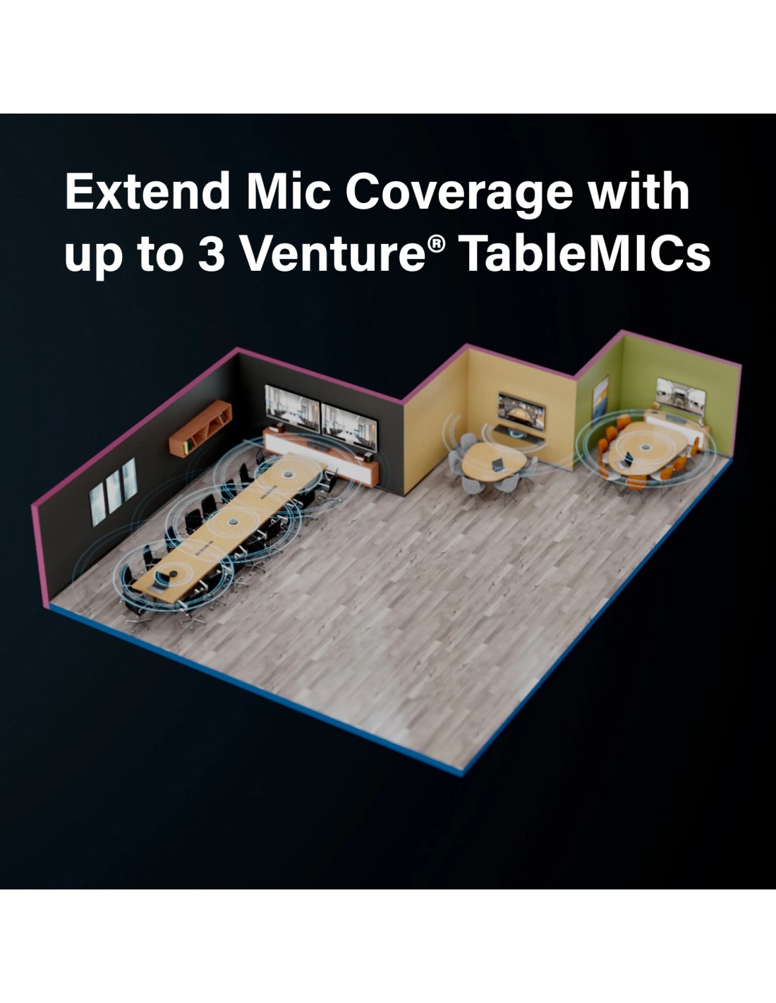 Controlla facilmente tutti i microfoni Venture nella stanza con il pulsante di disattivazione audio universale, che si illumina per indicare lo stato di accensione o di disattivazione audio. Espandendo la portata audio di Venture VideoBAR, Venture TableMIC assicura una qualità del suono chiara e uniforme, rendendolo un accessorio ideale per spazi per riunioni più grandi o dalla forma unica.