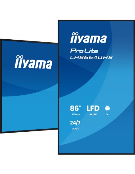 - Wall mounting kit included (VESA 800x600mm), Android 14, iiSignage² (CMS), iiControl (DMS), iiShare, EShare, iiBrowser, MediaPlayer, TeamViewer, File manager, FailOver