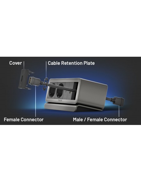 Questo contenitore mediahub2 è costituito da un telaio in alluminio solido a 5 slot progettato per il posizionamento autoportante su superfici da tavolo in sale riunioni, ambienti di lavoro ibridi o contesti didattici AV. I suoi moduli, progettati con precisione, utilizzano il sistema ICS (Individual Connection System), un’interfaccia senza utensili e senza viti che mantiene un’estetica pulita consentendo al contempo una personalizzazione di livello professionale in pochi secondi. Il contenitore viene fornito preconfigurato con una singola presa AC e tre alloggiamenti vuoti, permettendo un utilizzo immediato con possibilità di espansione futura. Dotato di un cavo di alimentazione integrato da 1 m e connettore Wieland GST18, l’unità si integra direttamente nelle reti di alimentazione dei mobili AV. La compatibilità con tutti i moduli, cavi e accessori di montaggio mediahub2 consente un rapido adattamento a installazioni fisse o sotto scrivania.