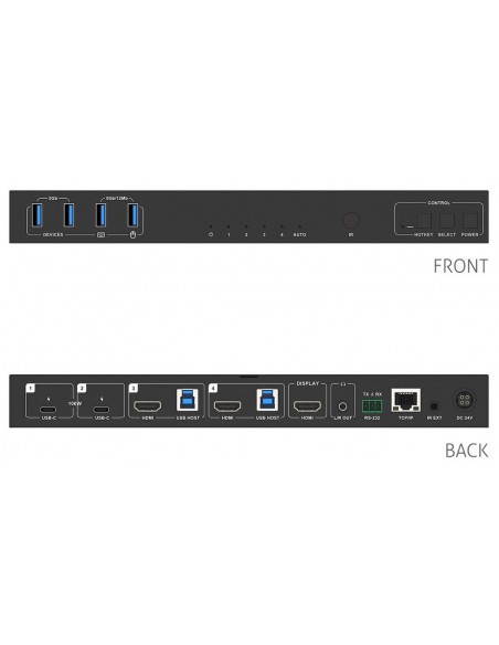 - Integrazione USB KVM completa: La connettività upstream include due porte USB-B e due USB-C, mentre quattro porte USB 3.2 Gen1 downstream offrono velocità fino a 5Gbps. Questa configurazione consente la condivisione fluida di tastiere, mouse e periferiche tra tutte le sorgenti collegate.