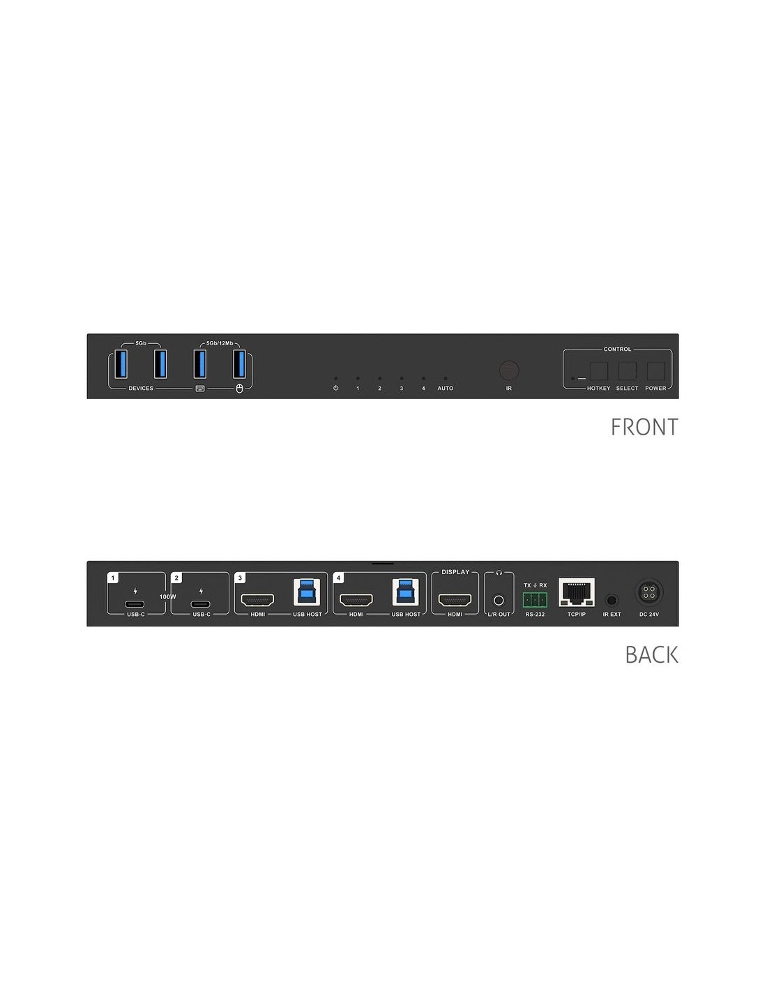 - Quattro ingressi con una singola uscita video, incl. 2x USB-C con Power Delivery condiviso da 100W