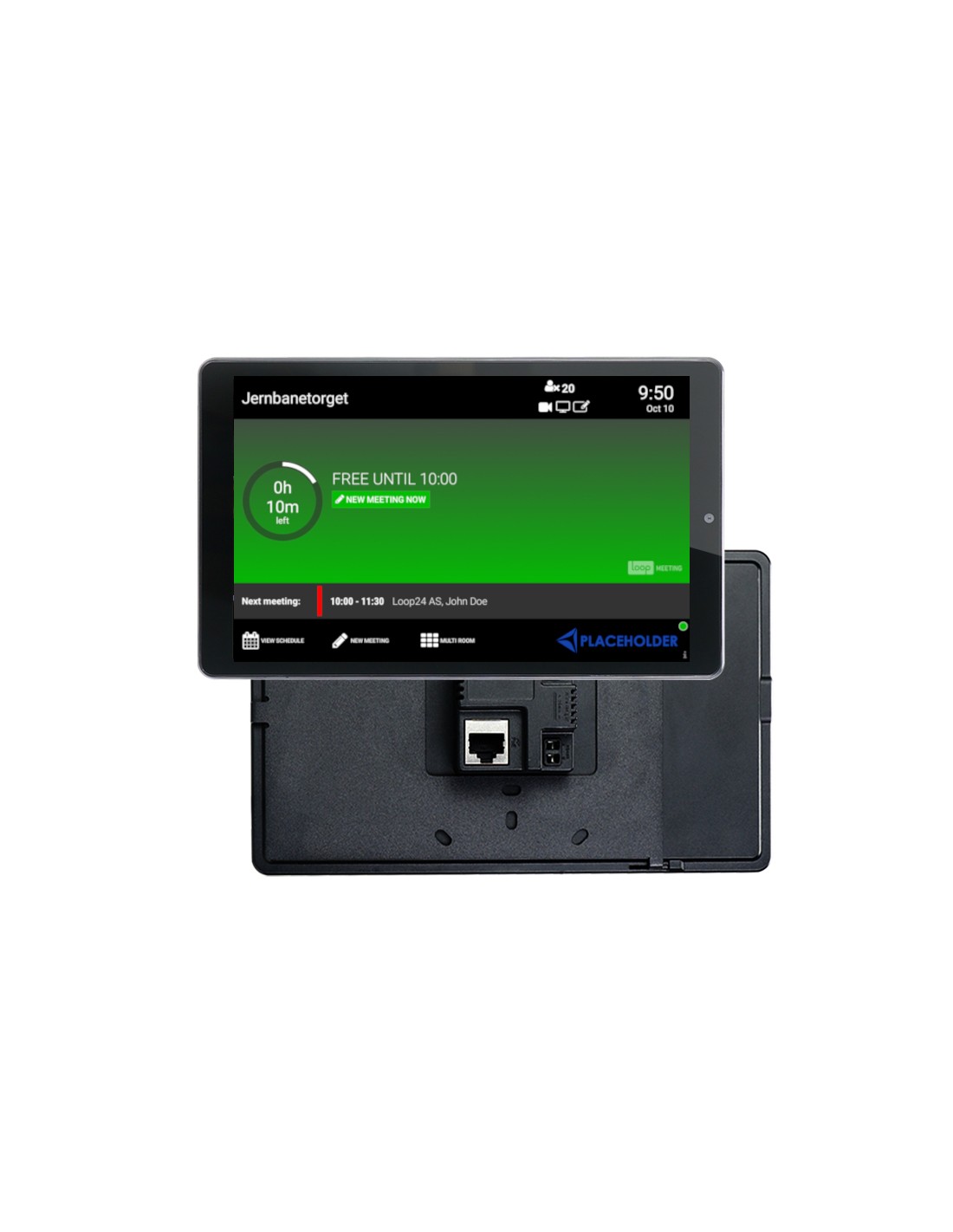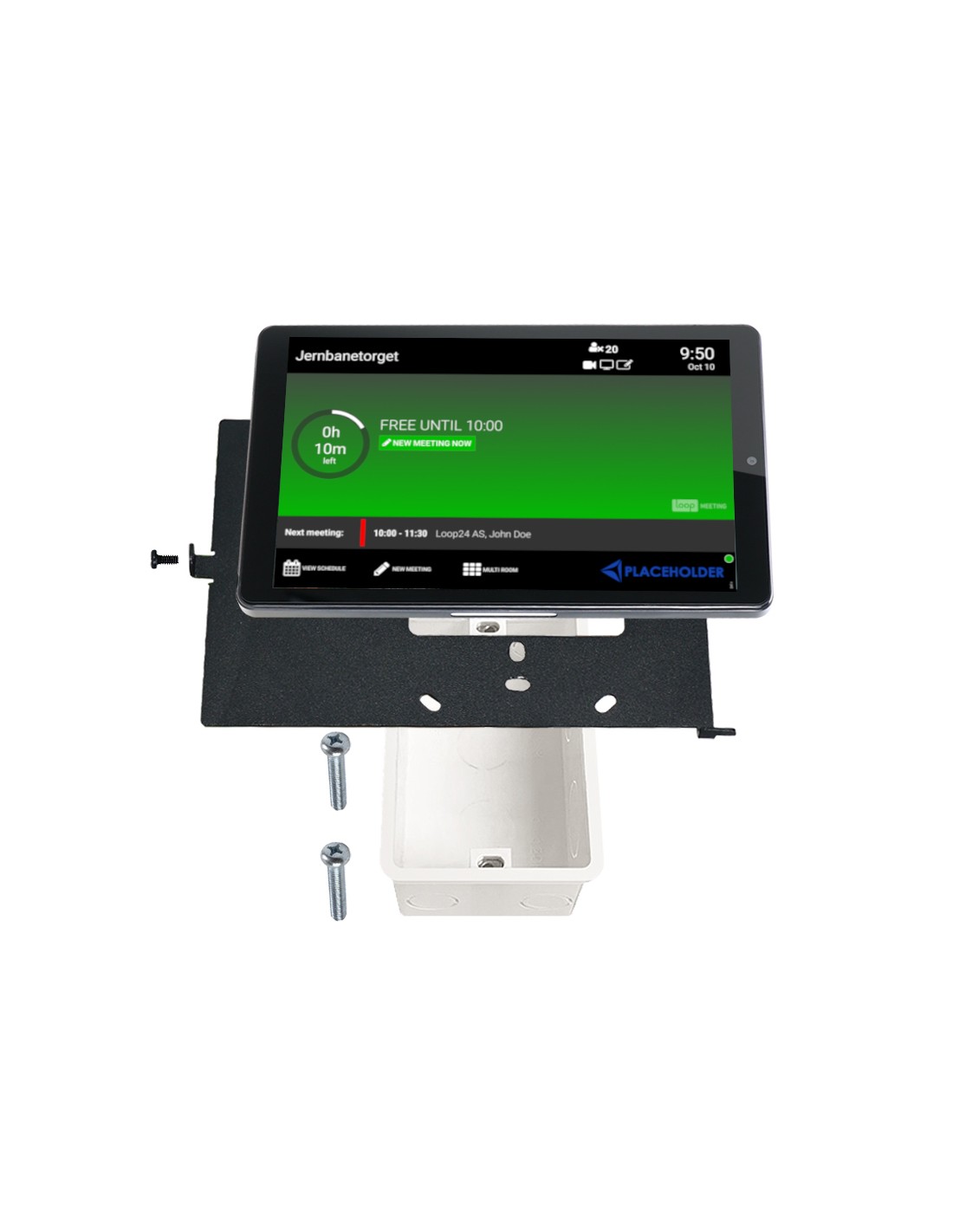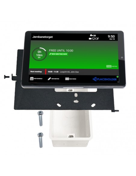 Pannello da 8 pollici per montaggio "a parete". Il pannello touch e la licenza a vita di LoopMeeting sono inclusi. Mostra la disponibilità della sala riunioni con luci LED su entrambi i lati del telaio del pannello. Compatibile con MS365, Exchange, Google Workspace, LoopBooking e Nexudus.