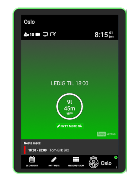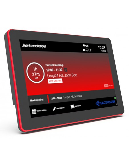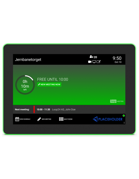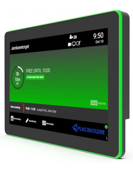 Pannello da 10,1 pollici che può essere montato su una parete in vetro su una parete normale con il kit di montaggio incluso. Pannello touch e licenza a vita di LoopMeeting inclusi. Mostra la disponibilità della sala riunioni con luci LED attorno alla cornice del pannello. Compatibile con MS365, Exchange, Google Workspace, LoopBooking e Nexudus.