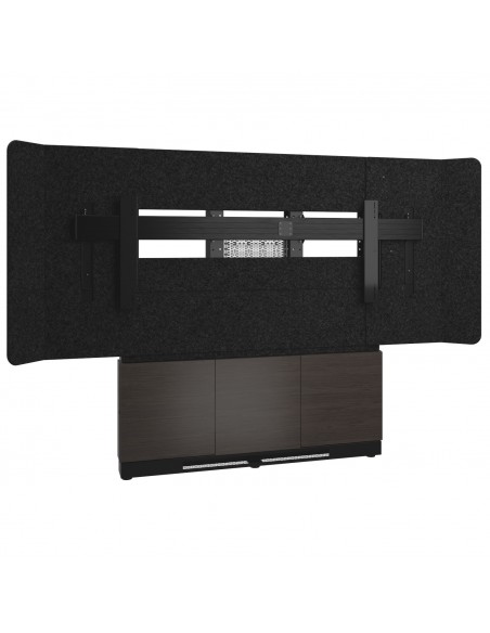La soluzione da pavimento con appoggio a parete Forum™ con una base a 3 ante per alloggiare i dispositivi AV (167,64 cm. di larghezza) è progettata per gli spazi di lavoro in cui è necessaria una collaborazione ibrida in spazi aperti o chiusi.