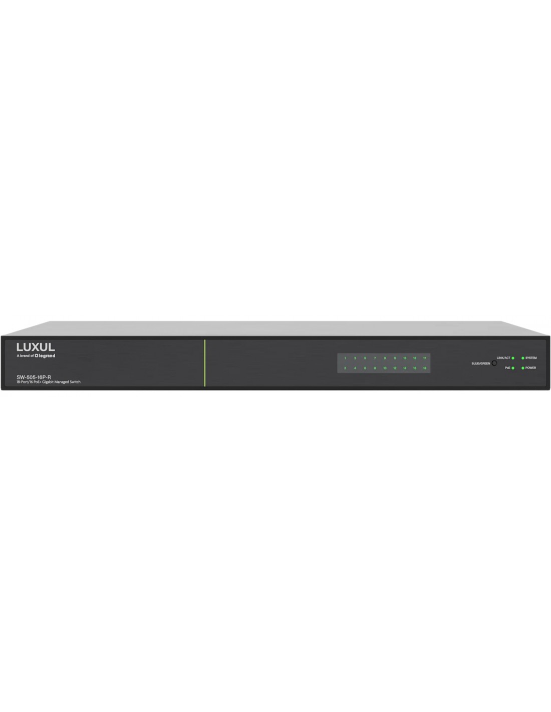 Lo SW-505-16P-R è uno switch PoE+ a 16 porte con montaggio a rack singolo, rivolto posteriormente, da 1 Gb, con 2 porte RJ45/SFP da 1 Gb (aggregabili fino a 2 Gbps) e un budget di potenza PoE totale di 185 W. Ciascuna delle porte SFP può essere utilizzata singolarmente o aggregata fino a 2 Gbps. Questo switch L2/L3 con capacità di switching di 36 Gbps offre VLAN, QoS e altre potenti funzionalità di gestione. È possibile raggruppare fino a 16 switch in un'unica interfaccia utente, consentendo un'amministrazione semplice e completa. Ventole a velocità variabile per un funzionamento silenzioso. Filtraggio degli ingressi ACL.