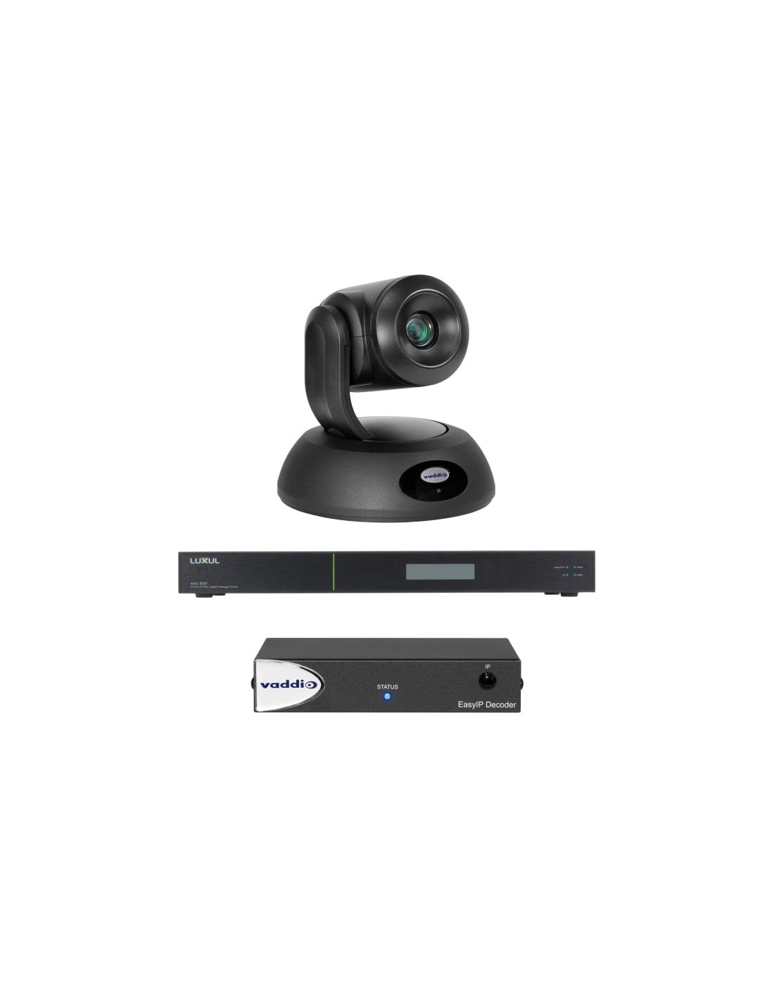 Il kit di base include tutto il necessario per iniziare con le conferenze AV-over-IP in un pacchetto facile da ordinare che include una videocamera EasyIP 20, un decoder EasyIP e uno switch Luxul EasyIP.