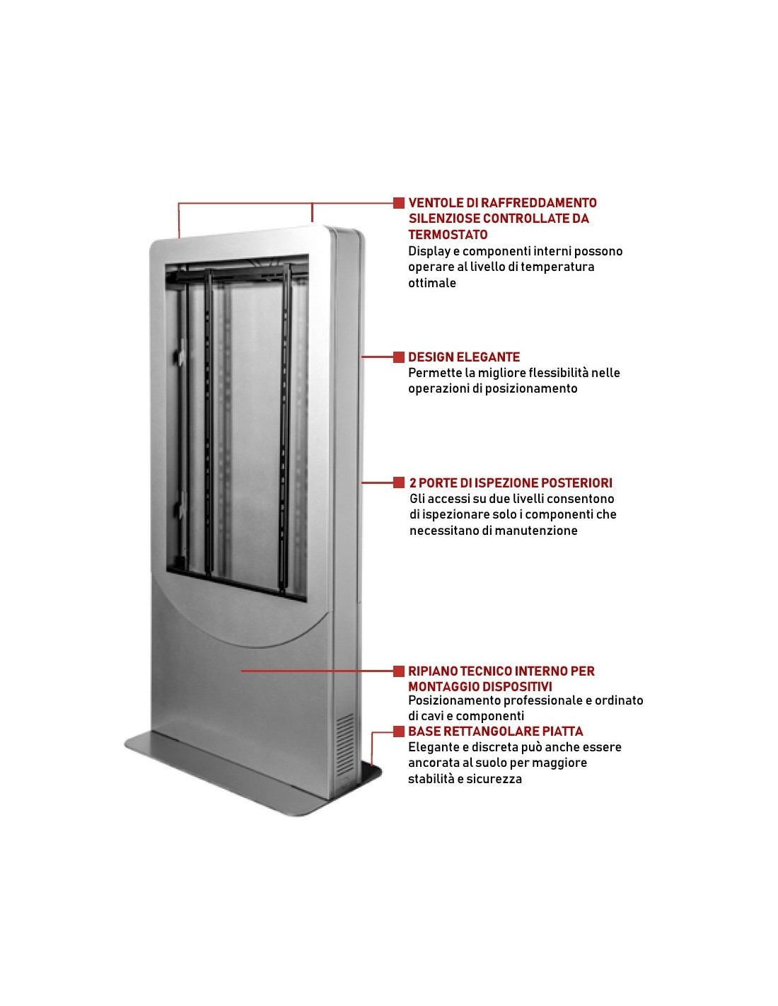 Totem con profili curvi da pavimento Portrait Nero. Totem verticale per interni Peerless-AV, progettato per supportare i più recenti display a LED e pannelli touchscreen fino a 10,16 cm. di profondità. Con una base piatta che può essere appoggiata liberamente o ancorata a pavimento, il Totem consente un accesso ai cablaggi elettrici e dati che semplifica l'installazione e la manutenzione. Inoltre, il Totem include due ventole di scarico controllate da un termostato silenzioso per garantire che il display e i componenti interni siano mantenuti ad una temperatura ottimale.Per mantenere un'estetica pulita, il chiosco offre un ripiano tecnico interno per lettori multimediali e organizzazione dei cavi oltre due porte posteriori che forniscono accesso diretto solo alle parti che richiedono manutenzione. Per la protezione antifurto, il Totem dispone di serrature a chiave dedicate. Questo Totem è la soluzione ideale per vari utilizzi in applicazioni da interno, tra cui aziendale, vendita al dettaglio e ospitalità.