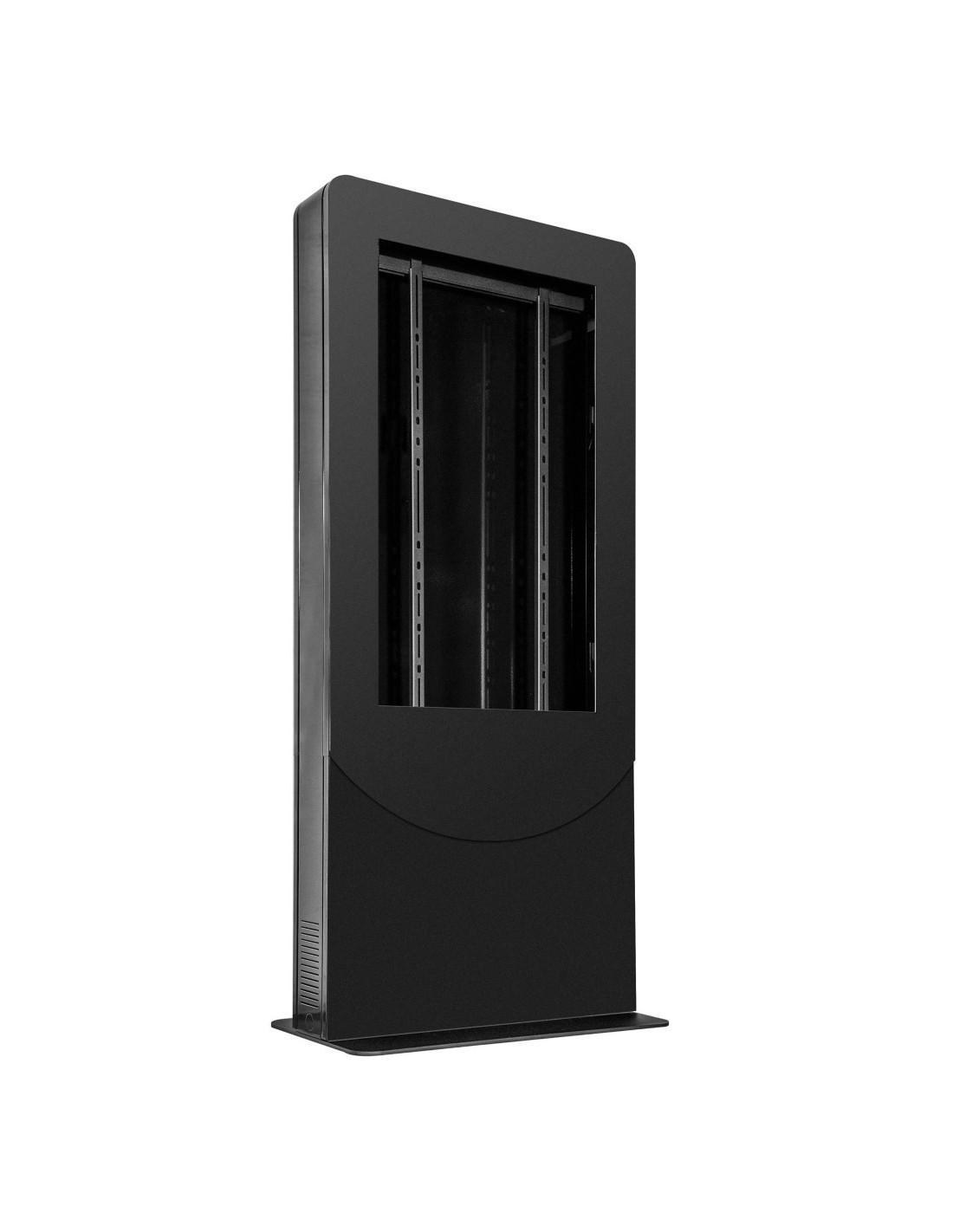Totem con profili curvi bi-facciale Portrait Nero. Progettato per display professionali ultrasottili o di maggiore spessore, questo Totem accentua l'aspetto elegante del display offrendo allo stesso tempo ampio spazio per integrare un lettore multimediale, un sistema interattivo, ecc., Per creare un'esperienza completa di Totem interattivo. Accoppiato con una vasta gamma di opzioni estetiche, questa linea modulare di Totem rende facile l'esecuzione di pubblicità o strategie di branding.