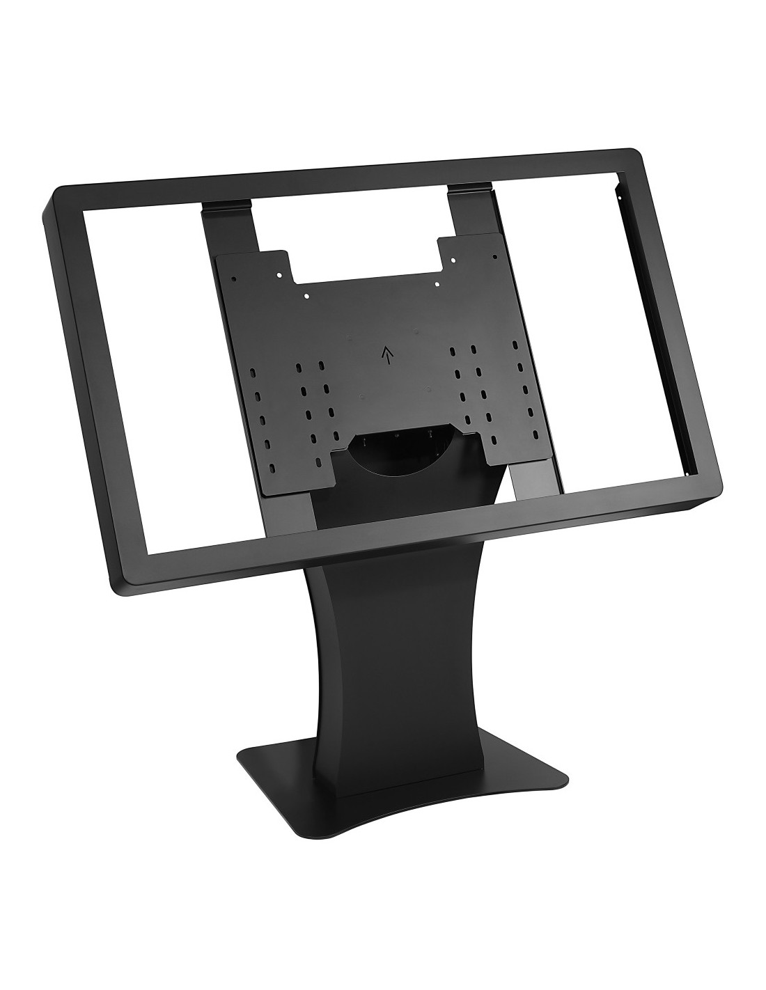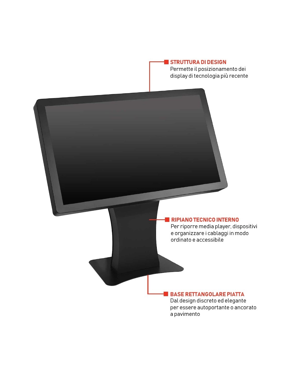 Elegante Totem per interni con orientamento Landscape (orizzontale) di colore nero, progettato per supportare i più recenti modelli di display per digital signage con spessore inferiore a 89 mm. Grazie alla sua base piatta può essere posizionato in modalità auto-portante o ancorato a pavimento e inoltre offre un rapido accesso ai cablaggi elettrici e di segnale, rendendo semplice l'installazione e le operazioni di manutenzione. Include un ripiano interno per posizionare dispositivi come media player e per organizzare al meglio i cablaggi. Una serratura esagonale lo protegge da manomissioni o furti. Questo totem è l'ideale per applicazioni di intrattenimento, wayfinding e qualsiasi altra soluzione che prevede un'installazione al chiuso in ambienti aziendali, retail, hospitality e oltre.
